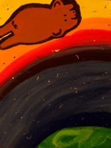 “I wanted to paint something to express my excitement and joy with her birth, but I didn’t know exactly what that would be. When I was more than halfway finished, I saw it: a pig flying over a rainbow. And isn’t that a perfect representation of what the miracle of life really is—bright and as unlikely as pigs flying?”